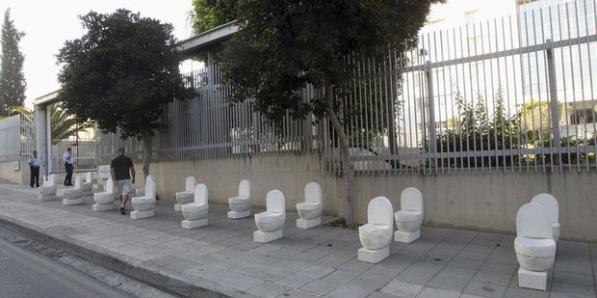 Banque Banque Des toilettes ont poussé devant la Banque centrale chypriote Un artiste chypriote a placé 20 toilettes en plâtre aux abords de la banque centrale chypriote lundi pour protester contre l'actuelle situation du système bancaire.