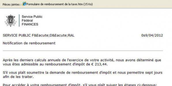 Banque Banque Non, vous n'avez pas droit à un remboursement d'impôt De nombreux contribuables sont victimes actuellement d'une tentative d'escroquerie, a indiqué mardi le SPF Finances. Ces contribuables ont reçu un courriel les avertissant qu'ils ont droit à un remboursement d'impôt. Les destinataires de ces courriels sont ensuite redirigés vers une page de site internet contrefaite qui utilise abusivement le logo officiel du SPF Finances.