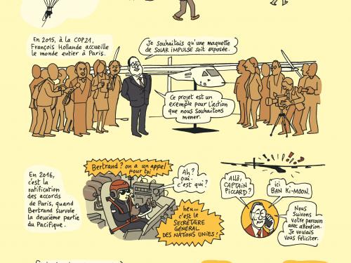 Bertrand Piccard multiplie les casquettes : explorateur, ambassadeur, entrepreneur et désormais… personnage de bande dessinée. Quand on le rencontre à Bruxelles, l’homme des tours du monde improbables (en ballon, à l’énergie solaire, bientôt à l’hydrogène) vient de décerner les prix du Pionneers Forum de sa Fondation Solar Impulse pour la transition écologique. Les chefs d’entreprise se pressent pour se prendre en photo avec lui. Une star.
