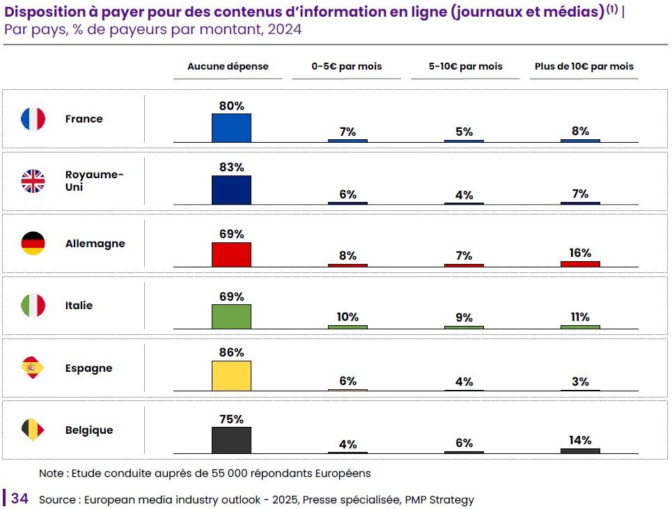 Cette faible disposition à payer n’est pas propre à la France et se retrouve dans de nombreux pays européens. La Belgique apparaît même légèrement mieux placée, avec 75 % des Belges qui déclarent ne pas être prêts à payer pour des contenus d’information en ligne. Petite consolation, ils sont 14% a se dire prêt à payer mensuellement 10 euros pour s’informer.