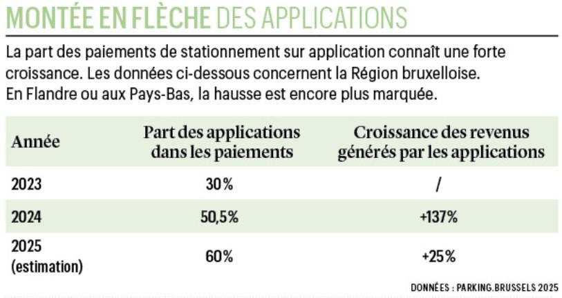 Il s’agit d’une étape dans la consolidation des applications de paiement de stationnement en voirie ou hors voirie, et d’autres services digitaux de mobilité. Ces programmes sont davantage utilisés que les horodateurs. “À Bruxelles, environ 60% des stationnements payants sur la voie publique sont réalisés à travers une application”, indique Pierre Vassart, porte-parole de parking.brussels, l’agence de stationnement de la capitale qui gère les parkings de 12 communes (bientôt 13 avec Woluwe-Saint-Pierre). “Cette proportion augmente fortement depuis le covid.” Et sans doute aussi depuis la multiplication des scan-cars.