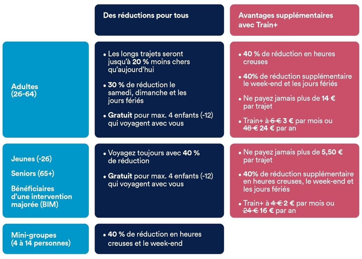 - Carte Train+ pour des tarifs plus bas. Cette carte ouvre l’accès à de nouvelles réductions. Pour les 26-64 ans, elle apporte une réduction de 40% aux heures creuses, et 40% de plus le w-e et les jours fériés, avec 14 euros maximum par trajet. Tarif : 6 euros par mois (3 euros jusqu’au 4 janvier). Pour les catégories seniors, jeunes et interventions majorées, la carte revient à 4 euros par mois (2 euros jusqu’au 4 janvier), ajoute une réduction supplémentaire de 40% aux heures creuses, le w-e et les jours fériés, avec un prix maximum de 5,5 euros par trajet.