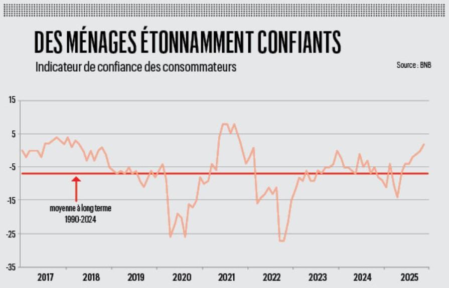 Et puis, il faudra aussi tenir à l’œil un autre indice dans les mois qui viennent : celui de la confiance des consommateurs. Une des questions qui taraudent aujourd’hui les économistes est en effet celle-ci : mais pourquoi donc le taux de confiance des ménages est-il particulièrement élevé ces derniers mois ? Car dans une situation où la guerre se trouve aux portes de l’Union européenne, où la guerre commerciale est déclarée par les États-Unis, où les dépenses publiques font des embardées inquiétantes, il est étonnant de voir, selon le baromètre de la Banque nationale, des consommateurs belges affichant une confiance supérieure à la moyenne historique et tirée spécialement par le fait que les Belges espèrent pouvoir épargner davantage.
