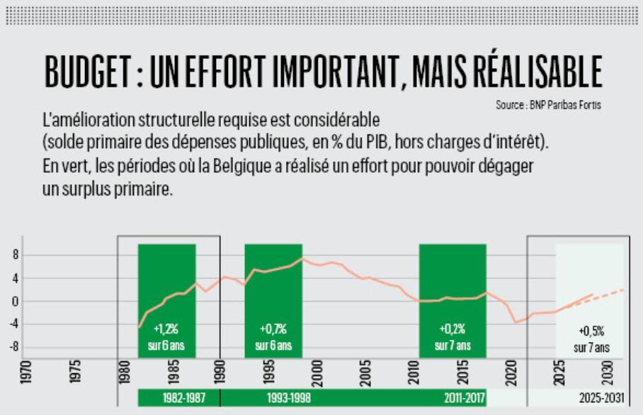 Koen De Leus rappelle que notre pays a en effet connu dans l’histoire récente deux périodes de sérieux assainissement budgétaire : celle de 1982-1987 et celle de 1992-1998. “Entre 1982 et 1987, dit-il, nous avons assisté chaque année à une diminution de la balance primaire de 1,2 point de pourcentage, ce qui est énorme. Pour les six années comprises entre 1992-98, l’effort a été de 0,7 point de PIB par an.”