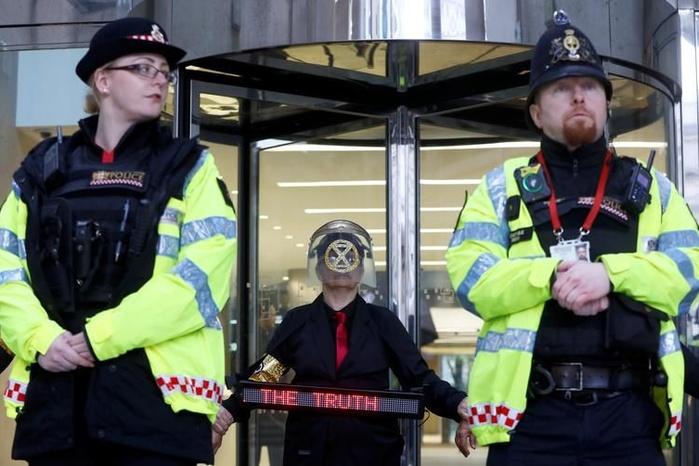 Des militants de l’organisation Extinction Rebellion bloquaient jeudi l’entrée de la Bourse de Londres, lors de leur onzième et dernière journée d’action dans la capitale britannique pour réclamer un “état d’urgence écologique”.