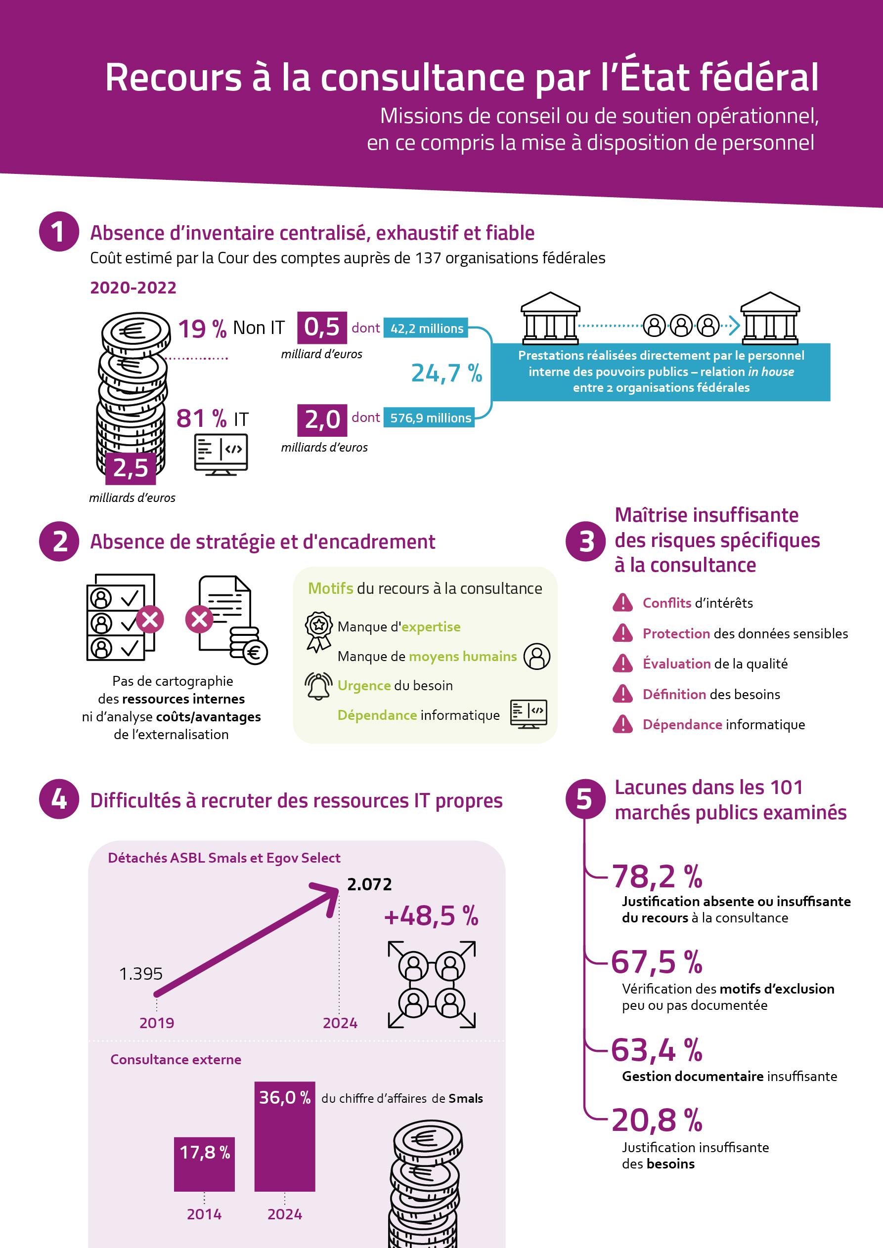 La Cour des comptes ne tourne pas autour du pot : l’État fédéral « ne dispose pas d’un inventaire centralisé, exhaustif et fiable » des prestations de consultance. Un constat déjà formulé en 2009 et 2015, mais jamais corrigé. Résultat : le coût réel du recours aux experts externes demeure inconnu, alors même que la dépense recensée a atteint 2,5 milliards d’euros en trois ans.