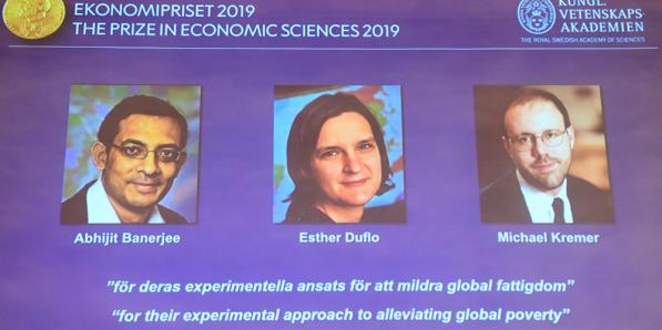 Politique économique Politique économique Le prix Nobel d'économie attribué à Esther Duflo, Abhijit Banerjee et Michael Kremer Le prix Nobel d'économie a été attribué lundi à la Franco-Américaine Esther Duflo et aux Américains Abhijit Banerjee et Michael Kremer pour leurs travaux sur la réduction de la pauvreté dans le monde.