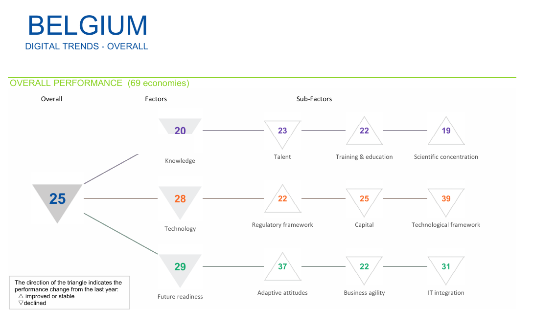 Dans les deux cas, le constat est le même : la compétitivité structurelle du pays s’érode. L’IMD (p.49) pointe la détérioration des indicateurs factuels de croissance et d’investissement, mais aussi un climat réglementaire jugé de plus en plus défavorable. La Fédération des Entreprises de Belgique (FEB), qui relaie ces résultats, parle d’un “paradoxe de l’innovation” : le pays dispose des talents et de la recherche, mais ne parvient pas à transformer ses atouts en croissance numérique réelle.