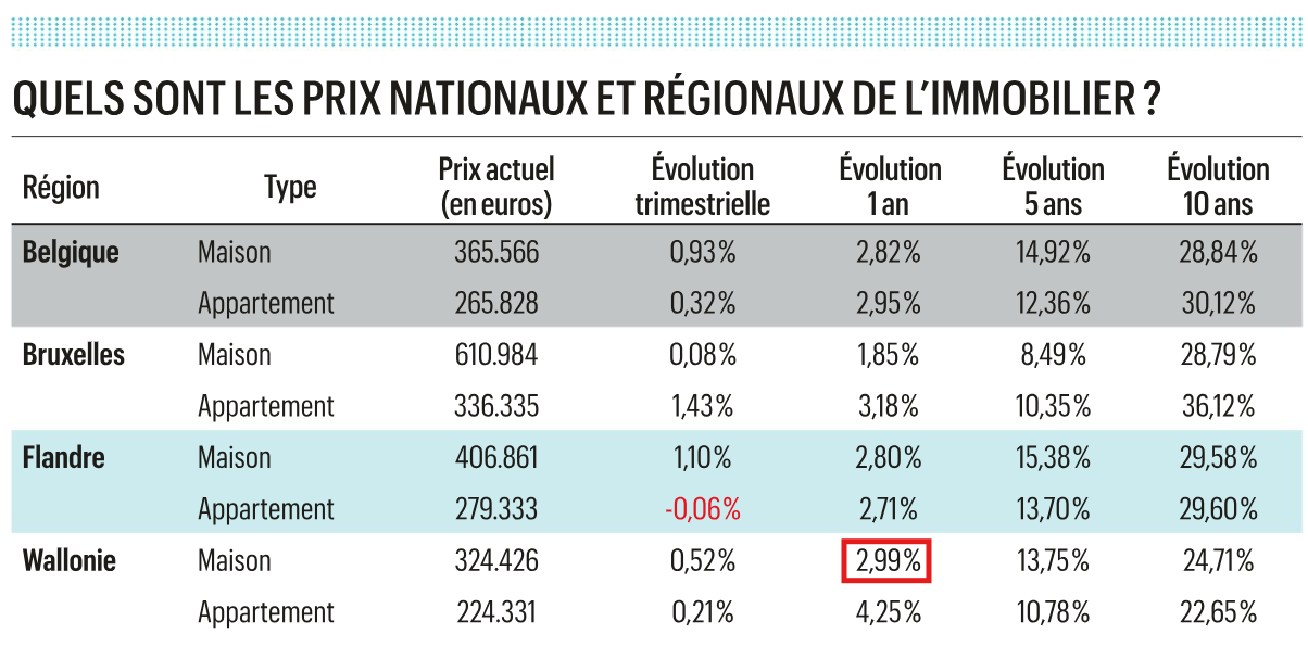 Plongeons-nous donc dans les chiffres de ce baromètre. Il y a d’abord un constat clair : le prix moyen d’une maison en Wallonie a bien augmenté de 12,9%, contre 5% pour la moyenne nationale et 2,8% en Flandre. Il est difficile de nier une particularité wallonne.