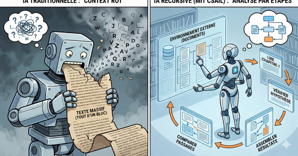Pour comprendre la différence, il faut imaginer un livre de mille pages. Une IA classique tente de lire l’ensemble du livre en une seule fois, puis d’en produire un résumé global. Plus le livre est long, plus la compréhension se dégrade. Une IA récursive procède autrement. Elle lit un chapitre, en extrait les éléments utiles, puis passe au suivant. Mais surtout, elle peut revenir à un chapitre déjà lu, comparer deux passages éloignés, vérifier une hypothèse, et réexaminer une section précise si nécessaire. En sorte, elle construit sa compréhension progressivement, comme le ferait un lecteur humain travaillant sur un texte complexe.