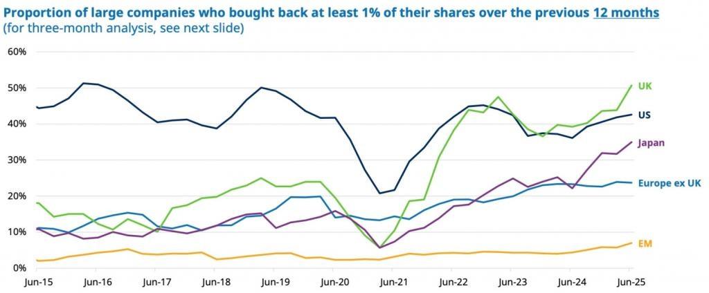 Bon, l’écart de valorisation avec les États-Unis est en grande partie justifié, mais la décote britannique est actuellement trop importante. En témoigne la vague d’achats d’actions propres par les sociétés cotées en bourse au Roayume-Uni au cours des quatre dernières années.
