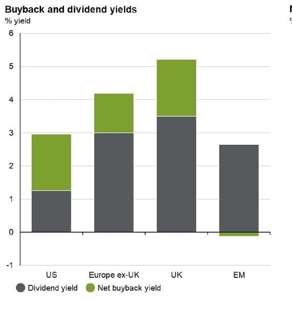 La bourse britannique offre également le rendement combiné le plus élevé entre le rachat d’actions propres et les dividendes.