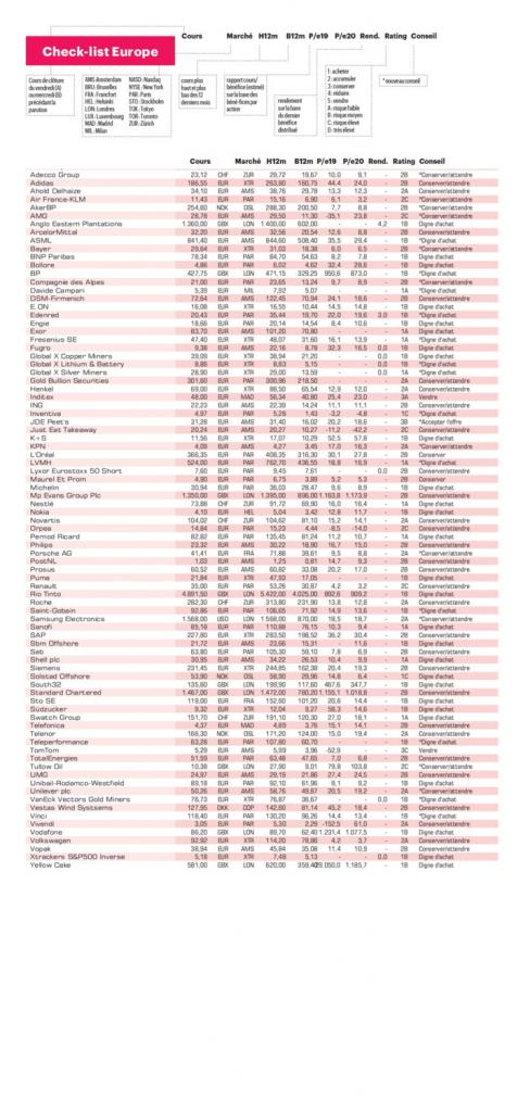 Acheter, vendre, ou conserver ? Voici les recommandations de la rédaction pour les principales actions européennes. L’avis a été mis à jour pour Samsung, Saint-Gobain, Porsche, BP et Adecco Group, en autres.