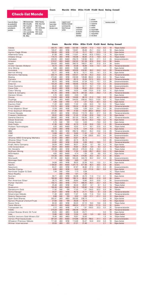 Cette liste comprend 87 actions internationales, principalement américaines, que les analystes de Trends-Tendances Bourse suivent activement. Découvrez leur recommandation pour chacune d’elles.