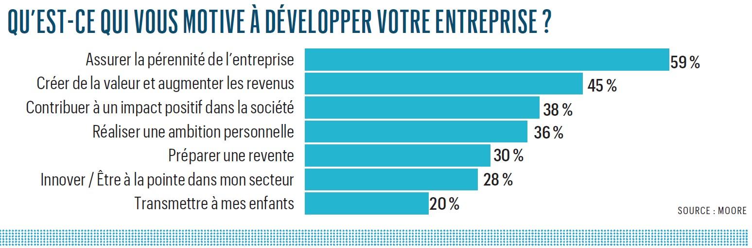 Parfois considérées comme plus fragiles par rapport à leur taille, les TPE et les PME sont plutôt plus agiles que de grandes entreprises où les décisions importantes mettent quelques fois davantage de temps à être prises. De nombreuses entreprises interrogées sont familiales. Ce caractère familial se traduit dans les réponses aux motivations de développement. En effet, assurer la pérennité de mon entreprise (59%) devance la création de valeur et l’augmentation des revenus (45%) et la contribution à un impact positif pour la société (38%).