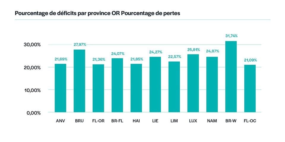 Les chiffres du KMOnitor 2025 placent les provinces wallonnes parmi les plus fragiles du pays. Le Brabant wallon détient le record national avec 31,7% d’entreprises en déficit, suivi de Bruxelles (28%). À titre de comparaison, la Flandre occidentale et orientale comptent environ 21% d’entreprises en perte, suivies d’Anvers (21,7%).