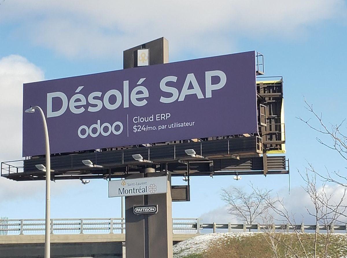 Pour imposer davantage sa marque aussi bien dans le paysage réel que numérique, Fabien Pinckaers ne s’est pas contenté de multiplier les voitures brandées Odoo sur les autoroutes belges (où les affiches publicitaires à des fins commerciales sont interdites, malin!), mais il a aussi opté pour une forme de publicité comparative tout autour de la planète. Ainsi, au Canada, une partenaire de l’entreprise wallonne a récemment pointé, avec humour, cette publicité déployée à Montréal avec ce slogan un brin arrogant ‘‘Désolé SAP’’ pour mieux mettre en valeur les prix compétitifs du ‘‘petit Belge’’.