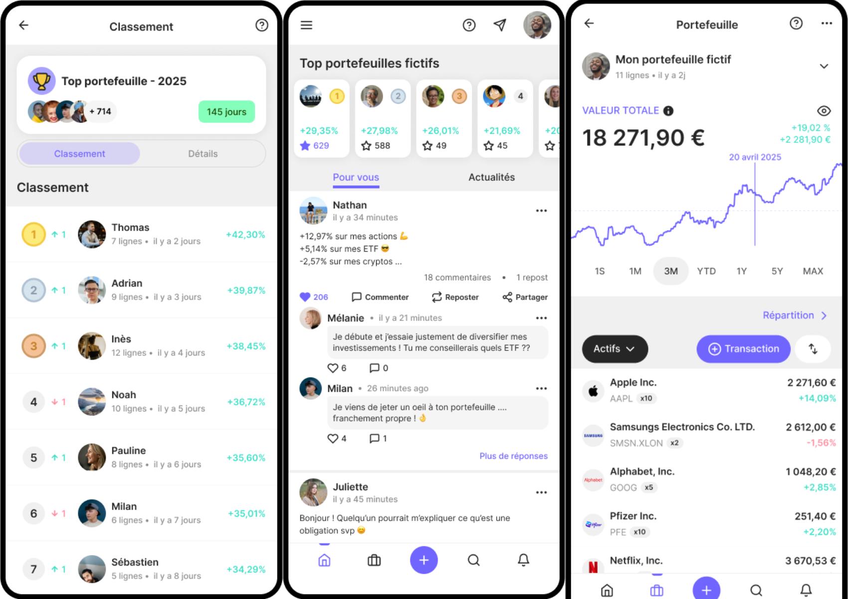 Ensuite, à côté de l’aspect réseau social, il y a aussi l’aspect investissement. La plateforme propose ainsi différents outils. Comme la création d’un portefeuille (fictif ou réel ; on pourra d’ailleurs bientôt importer et afficher son vrai portefeuille depuis son courtier ou sa banque). Ou le cours en direct, et la possibilité de suivre une entreprise cotée et donc de voir des publications d’utilisateurs ou articles de presse la concernant dans son fil. Ainsi qu’un classement des portefeuilles les plus performants.