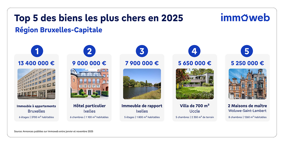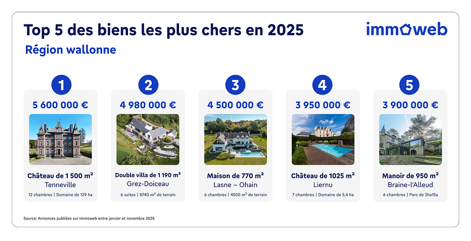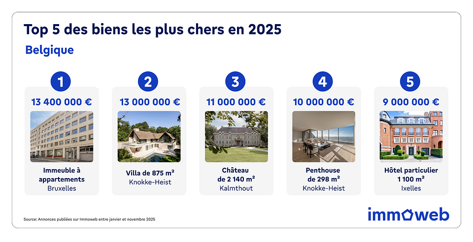 Avec plus de 500.000 visites par jour et 150.000 annonces actives, Immoweb est le site d’annonces immobilières le plus populaire du pays. En cette fin d’année, la plateforme révèle les biens les plus chers en Belgique, les annonces les plus populaires de 2025, ainsi que les quartiers et les communes les plus en vogue.