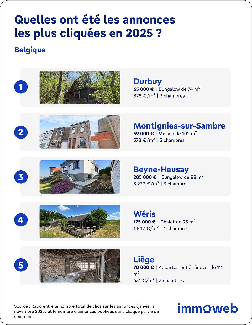 Dans sa rétrospective, Immoweb partage également les cinq annonces les plus consultées sur son site, toutes Régions confondues. Sur ce terrain, la Wallonie se démarque par rapport à la Flandre et Bruxelles, avec des biens très abordables.