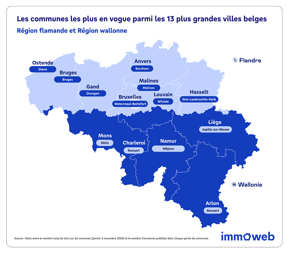 Enfin, le site d’annonces immobilières a dévoilé les communes les plus prisées parmi 13 des plus grandes villes de Flandre et Wallonie pour l’achat d’une maison ou d’un appartement en 2025.