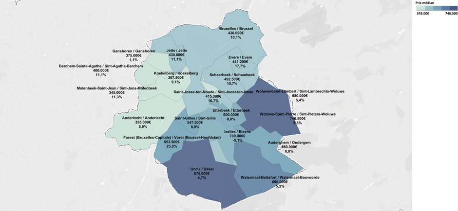 Woluwé-Saint-Pierre reste la commune la plus chère pour les maisons, avec un prix médian de 746.500 euros, alors que Molenbeek-Saint-Jean demeure la commune la plus abordable avec un prix médian de 345.000 euros.