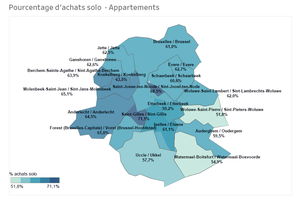 « Pour les appartements, c’est à nouveau Forest qui se distingue avec un taux d’achat à 88,1% par des Bruxellois, juste devant sa voisine de Saint-Gilles et ses 87,6% de Bruxellois. Les appartements de Woluwé-Saint-Pierre attirent à 28,4% des acheteurs venus de l’extérieur de la capitale. »
