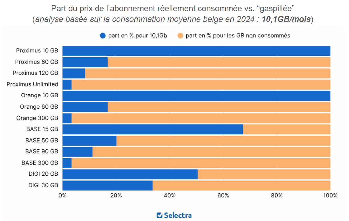 - avec un abonnement de 20 GB, la consommation moyenne représente environ 50% de la valeur payée.