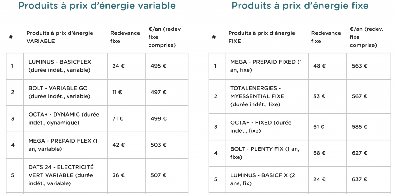 Il convient de rappeler que le tarif du contrat variable évolue selon les prix du marché. C’est un risque à endosser pour bénéficier des prix les plus intéressants. Ci-dessous, la CREG répertorie les contrats d’électricité les plus avantageux, en variable et en fixe.