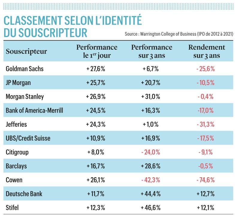 Plus surprenant, l’identité du souscripteur, c’est-à-dire la société orchestrant l’IPO, a aussi un impact considérable, comme le montre le graphique ci-contre. Le rendement sur trois ans ajusté au marché – soit la performance par rapport aux indices boursiers de référence – varie de – 31,3% pour Jefferies à + 12,7% pour Deutsche Bank, qui semble donc avoir moins tendance à surévaluer les prix d’introduction.