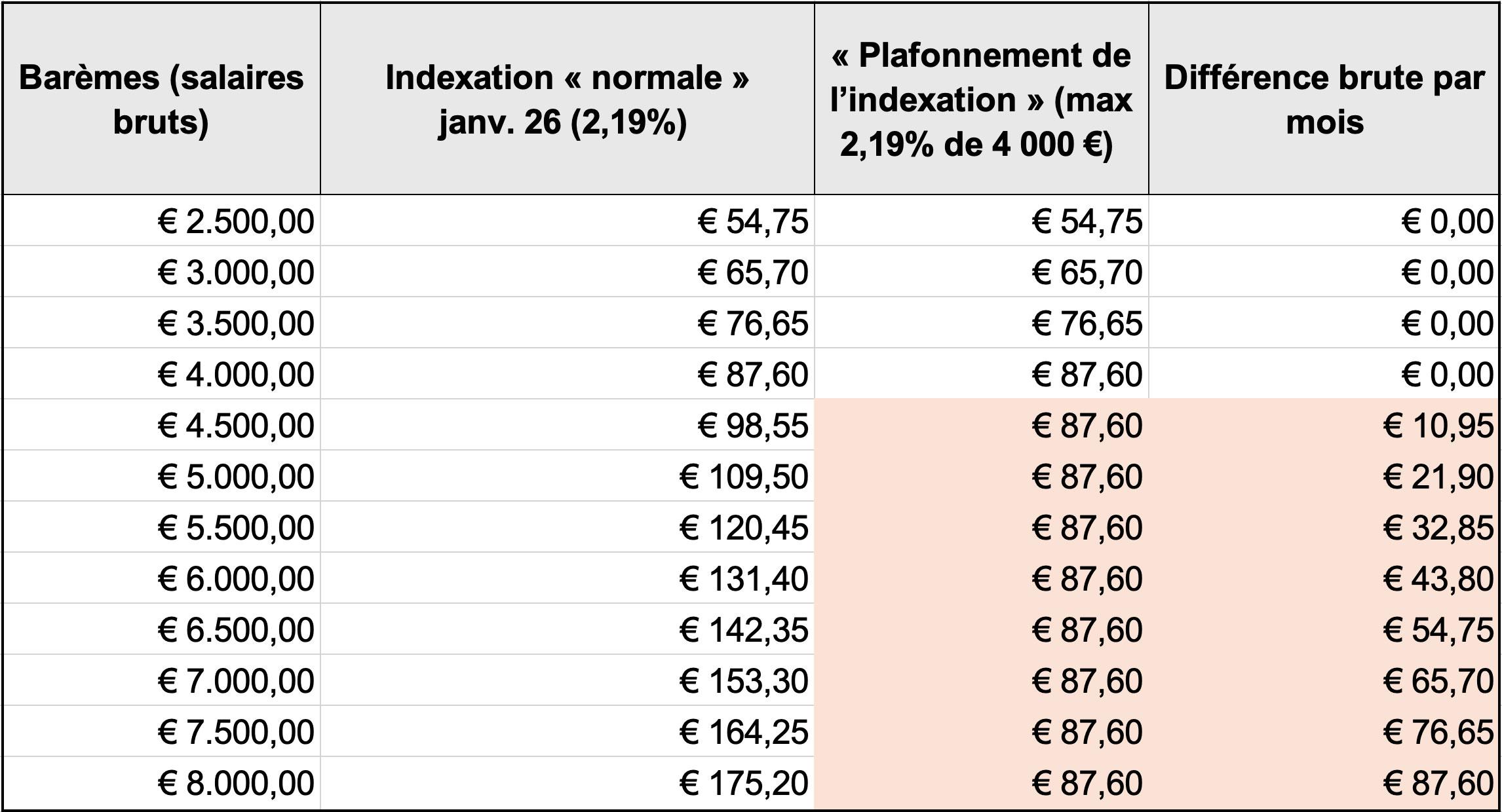 Un cadre à 5.000 euros bruts ne recevrait ainsi que 87,60 euros d’augmentation (2,19% de 4.000 euros) au lieu de 109,50 euros. Perte : 21,90 euros par mois, soit 262,80 euros annuels. À 6.000 euros, l’augmentation serait limitée à 87,60 euros au lieu de 131,40 euros. Perte : 43,80 euros mensuels ou 525,60 euros annuels.