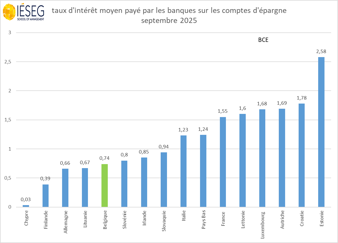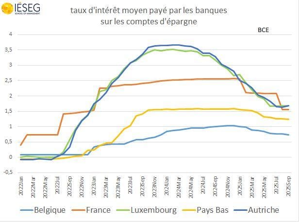 Le constat est clair : les Belges ne sont pas bien lotis dans la hiérarchie du taux d’intérêt moyen sur les comptes d’épargne. “Les banques des différents pays de la zone euro ont appliqué des politiques très différentes à l’égard de leurs clients épargnants, lors de l’augmentation des taux directeurs par la BCE pour lutter contre l’inflation, et puis lors du reflux de ces taux directeurs lorsque l’inflation a diminué”, explique Eric Dor.