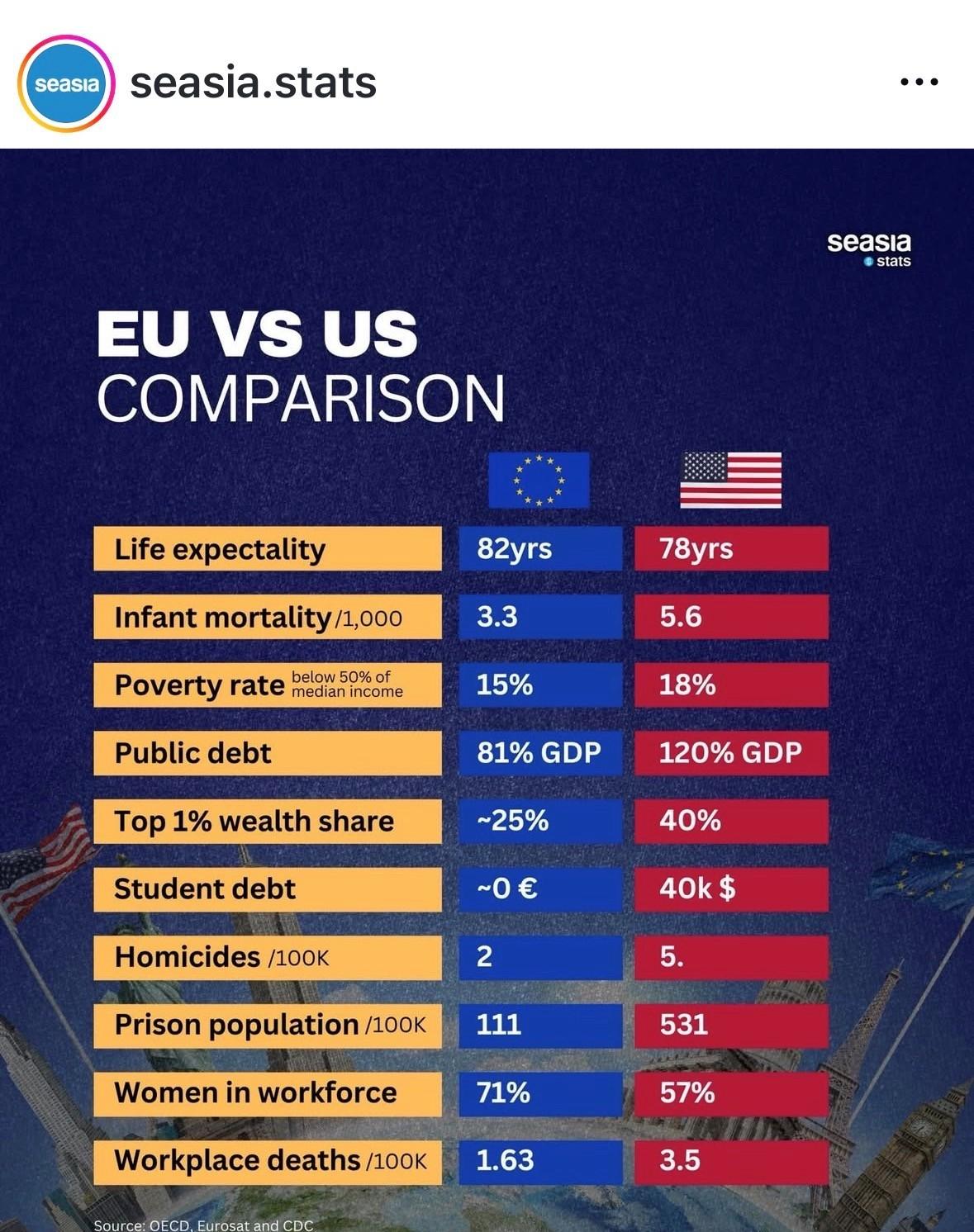 Vous avez sûrement vu passer ce tableau sur LinkedIn ou dans vos groupes WhatsApp. Moi, je l’ai reçu par un ami, ancien homme d’affaires, et qui me demandait ce que j’en pensais. Et ce tableau (voir ci-joint) est celui qui compare l’Europe et les États-Unis. On y voit que chez nous, on vit plus vieux, on est plus en sécurité et on n’a pas besoin de vendre un rein pour payer ses études.