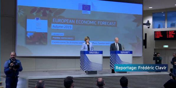 Vidéo | Z-News Vidéo | Z-News La Commission abaisse ses prévisions Les derniers chiffres sont clairs, l'économie européenne est entrée dans une période de croissance et d'inflation modérées. Peu probable qu'elles se redressent à court terme estime la Commission qui a révu ses prévisions à la baisse. Elle prévoit désormais pour la zone euro un PIB en progression d'1,1% cette année et d'1,2% à peine l'an prochain, au lieu d'1,4% espéré précédemment.